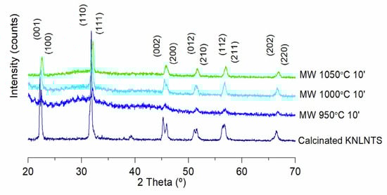 Figure 7 shows the X-ray diffraction patterns of KNL-NTS powders (previously calcined at 800 °C 2 h by conventional route) sintered by microwave at different temperatures, namely, 950, 1000 and 1050 °C with 10 min dwell time and a heating rate of 30 °C·min−1. The maximum sintering temperature when applying microwave technology was 1050 °C, since when this temperature is exceeded, the sample starts to melt.