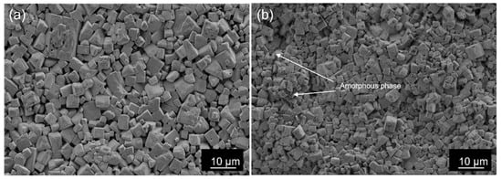 Microstructure images obtained by FE-SEM of KNL-NTS ceramics sintered by conventional (Figure 8a) and microwave (Figure 8b) processes show cuboidal structures typical of perovskite. Cuboids in the 5–8 µm range with well-defined grain boundaries are visible in the samples obtained by the conventional method with a sintering time of 16 h at 1100 °C. It is also possible to observe residues of the liquid phase typical of sintering of these materials [18,40]. The microstructure of the ceramics processed by microwave at 1050 °C for 10 min shows perovskite cubes with regular geometry, of size close to 2–5 µm; in addition, it is possible to identify the amorphous phase found in the X-ray diffraction patterns. The remains of the liquid phase confirm a sintering mechanism similar to conventional processing. However, there is no heterogeneous heating causing the amorphous phases.