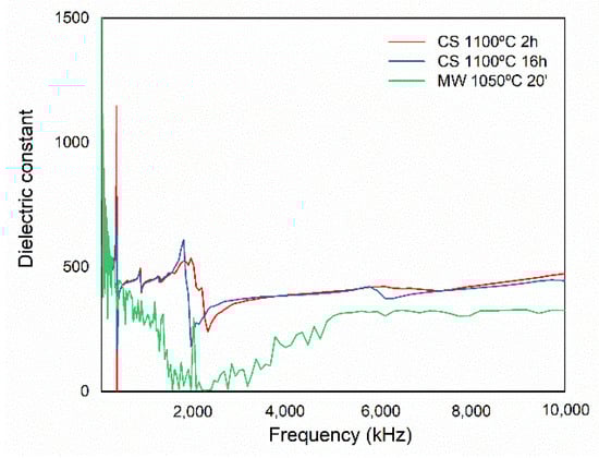 The room temperature dielectric constant of ceramics sintered by the conventional method at 1100 °C for 2 and 16 h and by microwave at 1050 °C for 20 min was measured. The results are shown in Figure 9.