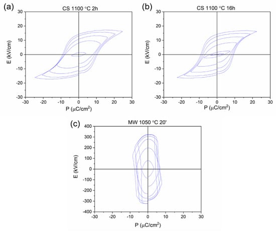 Figure 10 shows the ferroelectric cycles of the KNL-NTS ceramics sintered by conventional and microwave methods. The KNL-NTS sintered by the conventional method show very similar hysteresis cycles for 2 and 16 h at 1100 °C with saturation polarization (Ps) values at 3500 V of ~17 µC·cm−2. The remaining polarization for this voltage is ~15 µC·cm−2, while the coercive field is 10 KV·cm−1. Dwell time at maximum temperature is not a determining factor in the ferroelectric measurements for this type of sintering.