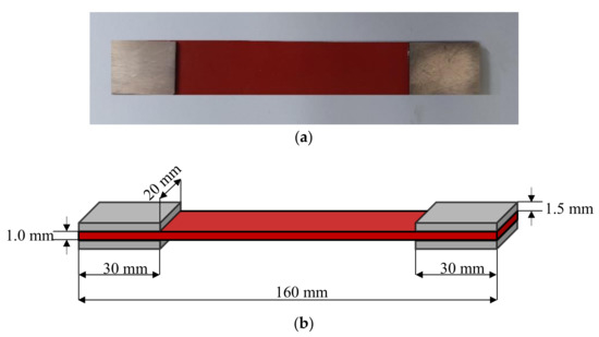 The specimen and its geometry employed in a uniaxial tensile test: (a) The image of silicone rubber specimen with bonded aluminum sheets; (b) The dimensions of silicone rubber specimen and aluminum sheets.