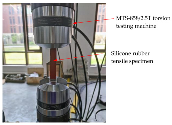 A strip specimen is adopted in the present uniaxial tensile test, as depicted in Figure 2. The geometry dimensions of the strip specimen are 160 mm × 20 mm × 1.0 mm, including 100 mm for the tensile test part, and 30 mm for the clamps at both ends of the specimen. Considering the thickness of the silicone rubber specimen is relatively thin, four aluminum sheets are bonded with 502 adhesive at the clamping region of tensile test machine to avoid local fracture at the clamping position, and the surface of the aluminum sheet is polished. All aluminum sheets have the same size, i.e., 30 mm × 20 mm × 1.5 mm. The test is carried out with MTS-858/2.5T torsion testing machine (SVL, Xi’an Jiaotong University) in air at room temperature, as shown in Figure 3. The test is performed in displacement-controlled mode with a constant loading rate of 20 mm/min.