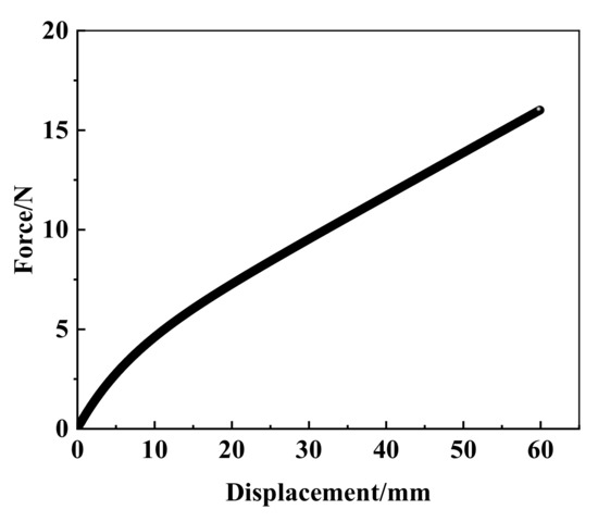 The force-load displacement curve collected by the experiment is presented in Figure 4. It can be seen that rubber shows obvious nonlinear characteristics. In detail, force varies linearly with the increasing displacement when the displacement is small, approximately 8 mm in present experiment, and the relation of force and displacement is in line with Hooke’s law. This is due to the rubber showing evident hyperelasticity during the large deformation. The slope of the force-displacement curve decreased slowly with the increase in displacement, and gradually tended toward a linear change again. The nominal stress–strain curve is obtained by processing the data of uniaxial tensile testing, as shown in Figure 5.