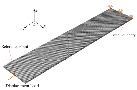 In this section, finite element simulation is carried out to obtain the learning samples of the GRNN model. Referring to the experimental conditions and geometry of the specimen, a numerical model is proposed. The silicone rubber specimen with bonded aluminum sheets is simplified to a rectangular geometry with a dimension of 100 mm × 20 mm × 1.0 mm. As depicted in Figure 6, one side of the strip specimen is fixed, and the other side is subjected to a uniaxial tensile displacement load of u3 = 20 mm over a time period of 60 s. The finite element mesh applied in this case consists of eight-node 3D stress elements with hybrid formulation (i.e., C3D8H). The mesh size is controlled by a global size of 0.5 mm. In special, a reference point is introduced to acquire the variations in force and displacement during the step time. So then, the displacement loading will be applied at the reference point, and transmitted through a reference point to the surface of the strip specimen.