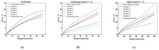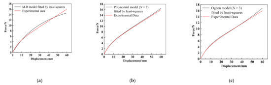 Results comparisons of: (a) M-R model; (b) polynomial model (N) = 2; and (c) Ogden model (N = 3) fitted by least-squares with experimental data.