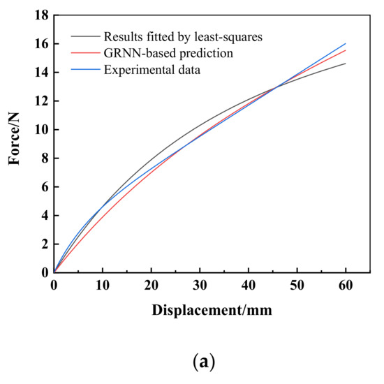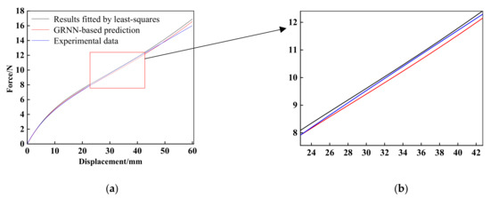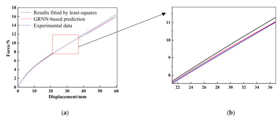 Similarly, the force-displacement curves associated with polynomial model (N = 2) obtained from least-squares (black curve), GRNN-based prediction (red curve) and experimental data (blue curve) are plotted in Figure 10. Intuitively, it is seen that the force-displacement curve calculated with GRNN-based prediction parameters is much closer to the experimental values than those resulted from least squares and is easy to analyze directly. In the present case, the corresponding values of the mean square error and mean absolute error for the GRNN-based approach are obtained as 0.5177 and 0.0954, which are less than those produced by least-squares, i.e., 0.6050 (mean square error) and 0.2385 (mean absolute error). It means that the GRNN-based prediction provides a better fit result than the simple fitting method, e.g., least-squares. For instance, the partially enlarged views of different deformation stages in Figure 10b are presented for different deformation stages. It can be concluded that the prediction results of the GRNN-based approach can maintain a relatively high accuracy for both small deformation and large deformation stages. In this model, the accuracy even increases with the displacement increasing within a certain range. In particular, from Figure 10, we can see the red curve (GRNN-based prediction) getting closer to the blue curve (experimental data) when the deformation varies from 8 to 40 mm.