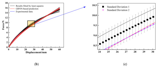Using the different M–R model parameters predicted by a GRNN-based approach (red curve) and least-squares (black curve), the corresponding force-displacement curves are numerically calculated and compared with the experimental data (blue curves), as shown in Figure 9a. It can be seen that there are many interactions among blue, red and black curves, thus the comparison of results for GRNN, least-squares and experiment cannot be directly observed. In this subsection, the error bars represented standard deviations (see Figure 9b,c) and are firstly introduced to describe the accuracy of GRNN-based prediction. The length of the error bar corresponds to the value of the standard deviation, which means the difference between mean value and sample data.