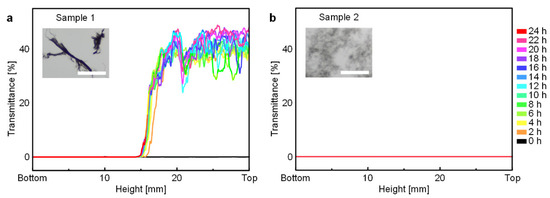 Turbiscan transmittance data of CNT/m-cresol dispersions. (a) The change of transmittance of Sample 1 (without the ultrasonication treatment) for 24 h. The optical microscopy image (inset) shows undispersed large CNT bundles. (b) The change of transmittance of Sample 2 (with the ultrasonication treatment) for 24 h. The optical microscopy image (inset) shows that large CNT bundles were de-bundled to small CNT bundles. Scale bars of inset optical microscopy images: 100 μm.