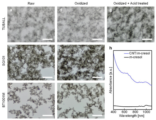 (a–g) Optical microscopy images of CNT/m-cresol dispersions (0.5 mg/mL): Raw (a) TUBALL, (b) SG101, and (c) BT1001M dispersions, oxidized (d) TUBALL, (e) SG101, and (f) BT1001M dispersions, oxidized and acid-treated (g) TUBALL dispersion. Scale bars: 100 μm. (h) UV-vis absorbance spectrum of CNT (TUBALL)/m-cresol dispersion (0.01 mg/mL).