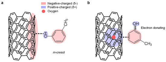 Schematic representations of the previous adsorption theories of m-cresol onto a CNT surface. (a) m-cresol and a CNT surface form a charge-transfer complex through m-cresol’s hydroxyl proton. (b) m-cresol’s negative-charged benzene ring adsorbs onto the oxygen-containing CNT basal surface.