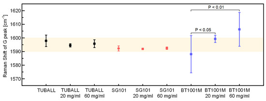 We obtained Raman spectra of various CNT samples and their mixture with m-cresol and measured the location of G peaks (Figure 4). The location of the G peak of the CNT/m-cresol mixture and that of the corresponding pure CNT samples were statistically compared by the one-sided t-test to see if there was a blue-shift in the G peak. As a result, there is no strong evidence to conclude that the G peak of the CNT/m-cresol mixture was blue-shifted at the level of significance of 0.05, except for the case of BT1001M, which is multi-walled (Figure 4). The exact p-values of CNT samples from the one-sided t-test are listed in Table S1.