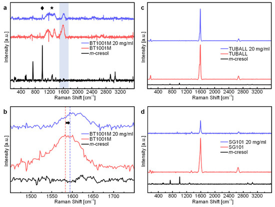 (a) Raman spectra of BT1001M/m-cresol mixture (20 mg/mL), BT1001M, and m-cresol. The diamond, star, and blue region indicate Raman shift ranges, those are the Raman spectrum of m-cresol affects that of BT1001M. (b) Magnified Raman spectra of the blue region (1450–1750 cm−1) of (a). (c) Raman spectra of TUBALL/m-cresol mixture (20 mg/mL), TUBALL, and m-cresol. (d) Raman spectra of SG101/m-cresol mixture (20 mg/mL), SG101, and m-cresol.