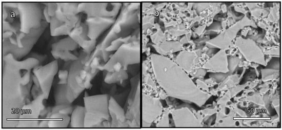 With the present investigation, for the sake of sustainability, further evidence of the fluxing action was explored. Figure 1c,d confirms that firing at only 650 °C still enabled some consolidation, with the significant advantage of nearly complete preservation of open porosity. As shown in Table 1, the closed porosity was almost negligible (<3 vol%). Considering the new foams were nearly completely open-celled, the crushing strength of approximately 4 MPa was quite high, compared with that (~8 MPa) of previous foams fired at 700 °C. According to the Gibson–Ashby model [23], the compressive strength of cellular solid, σc, is a complex function of relative density (ρrel = 1 − P, where P is the total porosity):