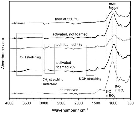 The last observation is supported by the results of infrared spectroscopy, as illustrated in Figure 3. The spectra of various variants of hardened glass suspensions after drying (the initial surfactant addition of 2–4 wt.%, no addition of surfactant) are shown. In all cases, hydration was confirmed by the bands at 3400 cm−1, O-H stretching, and 1600 cm−1, SiOH stretching [25]; the addition of surfactant is documented by the band at about 2800 cm−1 attributed to C-H2 stretch vibrations [10]. A marked difference of the main band, centered at 1000–1050 cm−1 and corresponding to tetrahedral stretching modes of Si-O (Si) and Si-O (Al) bridges was observed. The ‘main bonds’ in the network of the studied glass were significantly altered in foamed suspensions, the effect being more pronounced at increasing surfactant addition. The asymmetry of the peak at 1000–1050 cm−1 could be attributed to an increased amount of BO4 tetrahedral units (with B-O stretching vibration corresponding to a band at about 900 cm−1) compared to BO3 trigonal units (with B-O stretching vibration attributed to a band at about 1200 cm−1) [25,26]. No differences were noted after firing at 550 °C (we report a single spectrum, collected for a foam after firing); the residue of thermal decomposition of the gel (of any nature) was likely included in the glass, altering the structure (as demonstrated by the shape of the main band positioned at 1000–1050 cm−1).