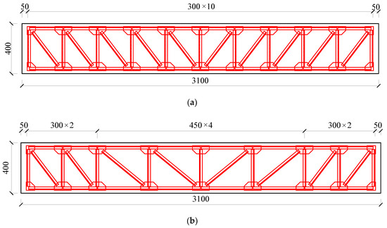 Liu Qiang [20] designed the fabrication of six test beams for testing and verifying the performance of truss-type steel-reinforced concrete box beams, as shown in Figure 1. In order to ensure that the flexural failure of the box girder conforms to the failure mode of the appropriate reinforcement beam, the truss joint adopts a thickened gusset plate and three side circumferential seam welding to improve the bearing capacity of the joint. The concrete grade is C30, the measured compressive strength of concrete cube is 30.9 MPa. The modulus of elasticity is 3.00104 GPa, the precast truss steel is Q235, and the measured values of mechanical properties are shown in Table 1, the thickness of angle protection layer is 30 mm, and other specific parameters of the six beams are shown in Table 2.