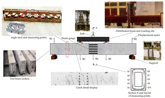 The loading test method and measurement points were designed as shown below in Figure 2. The test specimens were simply supported specimens with a span of 3100 mm. The three-point loading was adopted, and the strain of angle steel was measured by a TS3890 static resistance strain gauge (S1-S4). The model of the resistance strain gauge was BFH120-3AA-D100, the resistance value was 120 Ω, the sensitivity coefficient K = 2.0 ± 1%, and B1-B5 were dial indicators (accuracy: 0.01 mm) to measure displacement. The strain gauge was used to measure the displacement of the loading point, span, and support, respectively. Q1-Q10 were the dial indicators (accuracy: 0.001 mm) to measure the concrete surface strain. They were symmetrically distributed, with an upper and lower spacing of 75 mm as shown in Figure 2.