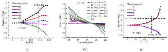 Figure 4 shows the change in the measured strain value of beam A3 with load, and a strain pattern diagram was added to show the strain change more vividly before and after loading. The characteristic loads are indicated by dashed lines, and the results show that the curves had the same trend as the Ej-Fj curve, which was divided into three different stages of development by points P and Q. As can be seen from the curve of strain versus load, the strain values at each measurement point were usually very small before the characteristic point P. The curves almost overlapped, were very close to each other, and remained essentially linear. It can be seen that the beam was in a state of elastic stress and the tensile strain of the concrete at the tensile edge had not yet reached the ultimate tensile strain. After that, the strain curve of the beam grew significantly and separated, and the beam entered the plastic development stage. The tensile zone was subjected to angular tensile stresses and the concrete was withdrawn from the works. From characteristic point P to Q, the strain increased more rapidly compared to the previous stage. The angle steel had good mechanical properties, and the outsourced concrete could effectively prevent the local buckling of the angle steel, which could effectively control the structural deformations. Therefore, the stress-strain curve changed smoothly. When it was over the characteristic load Q, the curves changed in unstable trends, which shows a certain abrupt change characteristic. The beam began to be in a state of instability and stress and entered the failure development stage. Eventually, the concrete in the compression zone was crushed and the beam was destroyed.