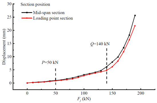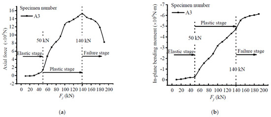 Under the action of a load, the test beam was mainly subjected to axial pressure and an in-plane bending moment, and they were separated from each other in order for the changing trend of the structural stressing state under different internal forces to be studied. The axial force and in-plane bending moment were direct manifestations of the structural stressing state, and they are plotted in Figure 11. It can be seen that the axial force first increased then decreased, while the in-plane bending moment occurred all the time. The maximum axial force and bending moment in the whole loading process were at load Q about 1500 kN and at the ultimate load about −740 kN, respectively. The sudden deviation of the changing trend for the two curves can also be clearly identified before and after loads P and Q; hence, three structural stressing state stages were divided, which were the elastic stage, plastic stage, and failure stage, respectively. The changing characteristics are shown in the Ej-Fj curve and once again verify the previous discovery.