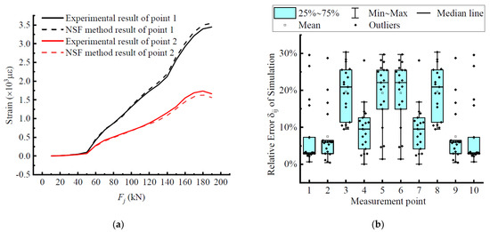 Take measurement points 1 and 2 as examples to clearly observe the fitting degree between the interpolation data and measurement data, as shown in Figure 8. It can be clearly seen in Figure 8a that the two curves achieved a high degree of fit throughout the loading process and even overlapped in most stages, which indicates that the data derived from applying this difference method have a fairly high accuracy, a high degree of fit to the experimental results, and relatively small errors, which can meet the application requirements. Figure 8b shows the statistical information of its errors represented by a box-line plot, where the fit can be more obviously seen. The height of the quadrature spacing boxes of measurement point 1 and measurement point 2 was relatively small, so the data show a certain concentration phenomenon and the average error was small. It echoes with the previous curve fitting results, which further verifies the rationality and scientific effectiveness of the NSF interpolation method. By comparison, all measurement points were within the error tolerance range, indicating that the extension of the test data by this interpolation method is scientific and reasonable, and is an extension of the structural analysis method, which can be used as an important tool for analyzing the stress state of beams.