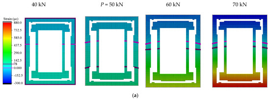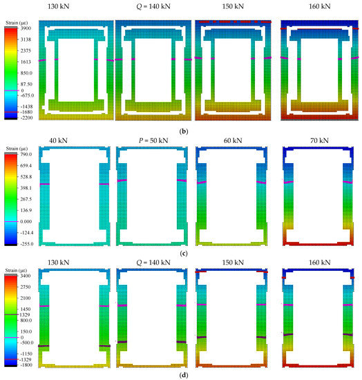 Figure 9 depicts the concrete strain field diagram obtained by the interpolation method near the P-value and Q-value load of the mid-span section, and the same section uses the same colorimetric and scale, marking the main grade scale value and 0 value position on the scale. The boundary line where the strain is 0 is marked with a magenta line, the peak tensile strain is marked with a purple line, and the peak compressive strain is marked with a red line. The specimen was directly subjected to the downward load, and the cross-section presents a state of upper compression and lower tension. The red area indicates the maximum tension, and the blue area indicates the maximum compression. It can be seen that the area of the tension zone of the entire cross-section was larger than the compression zone. Before the load P, the color of the strain field was lighter, and the concrete had not yet reached the ultimate tensile strain, meaning that the concrete was still in the elastic working stage at this time, and no cracks had occurred. When the load was at the P-value, due to the appearance of cracks, the tensile strain peak line appeared on the cloud diagram. Compared with the previous, the strain field changed significantly, and the peak line gradually moved upward with the increasing load, leading to the upward development of the crack. It can be concluded that the stress state of the structure changed after 50 kN, but the development of the strain field remained relatively stable. In addition, in Figure 9d the appearance of the peak line on the figure of the angle steel indicates that the tension zone had reached the tensile strain at the yield, and as the load increased, the position of the peak line gradually moved upward. As the neutral axis moved upward, more and more concrete lost its ability to resist tension, as the tensile stress on the angle steel continued to increase. After the limit value and Q value, the color of the concrete gradually darkened, and a compressive strain peak line appeared, indicating that the force state of the member was no longer stable at this time. The maximum tensile/compressive strain value of the cross-section increased with the increase in the load, the tensile area was continuously reduced, and its changed forms all had a sudden change after the Q value. The compressive strain peak line of the angle steel was also generated, and the super large strain value appeared near the lower part of the section. The compressive strain peak line of the angle steel was also generated, and the super large tensile strain value appeared near the lower part of the section, which shows that the structure was in an unstable state and had potential risks. The structural stress state of the beam jumped, and the continuous loading entered the failure stage. Finally, the concrete in the compression zone was crushed, resulting in the complete failure of the beam.