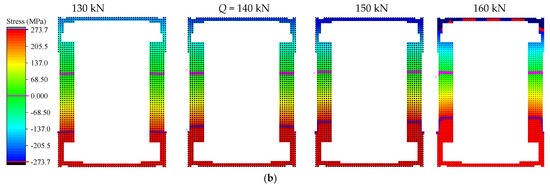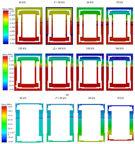 In order to further observe the changing characteristics of the structural stressing state around the characteristic loads, the stress fields of concrete and angle steel were plotted in Figure 10, respectively. The maximum compressive stress of concrete was 30.7 MPa, which was close to the compressive strength of the cube. The corresponding peak line was generated after load Q and developed downward from the upper edge of the section. After load P, the minimum tensile stress in the concrete reached a maximum value (1.43 MPa), resulting in cracks. From then on, the concrete in the tensile zone stopped working and the stresses were redistributed. Some characteristics of the changes in the stress field can be observed before and after load P. The tensile stress in the angle continued to increase with the increase in load. In the concrete stress field, it can be seen that as the load continued to increase, the area surrounded by the maximum tensile strain peak line of the concrete and the strain line with a strain of 0 gradually decreased. After load Q, the stress field was characterized by abrupt changes, such as the compressive zone of concrete and the tensile zone of angle steel. Through the above, it was found that loads P and Q could indeed define the change characteristics of the structural stressing state for the beam more accurately.