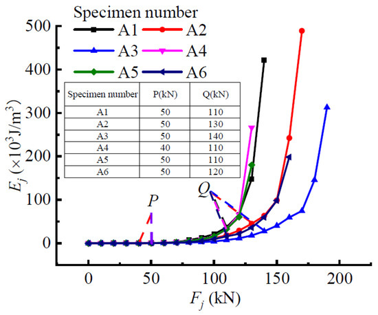 With reference to the analysis method of beam-A3, the evolution law of the structural stressing state of other test beams under the same loading conditions were compared and analyzed in turn. Figure 12 shows the Ej-Fj curves of all the beams, and it is still obvious that the curve change in the entire loading process can be divided into three stages by their respective characteristic loads. The magnitude of the lower chord angle was an important factor affecting the strain energy response of the members, but by comparing loads P for A1, A2, and A3, it had almost no effect on the elastic-plastic boundary point of the angular concrete beam, indicating that the determination of the mutation point may be related to the material properties of the concrete only. As for the second load Q, its value increased as the size of the lower chord angle steel increased. In other words, the change in the size of the bottom chord angle steel can affect the failure load of the component; thus, the larger the size, the greater the bearing capacity.