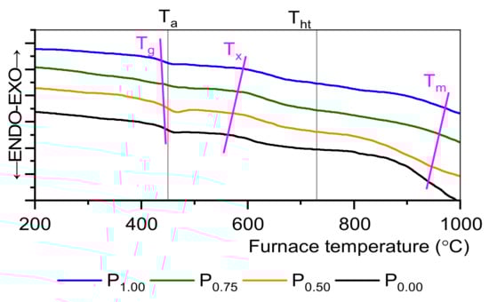 DSC curves. Temperatures: Tg—glass transition, Tht—heat treatment, Tx—crystallization, Ta—annealing, and Tc—crystallization peak.