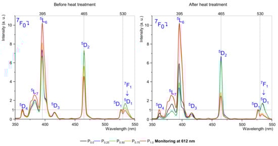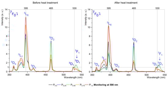 Excitation spectra studies at two wavelengths, 590 nm and 612 nm, were performed to determine the effect of the molar content of nucleator ions and the heat treatment process on the excitation bands as a function of P2O5 concentration. The excitation spectra of the fabricated samples were measured for emission monitored at the wavelengths of 590 nm (Figure 2) and 612 nm (Figure 3), corresponding to magnetic dipole and electric-dipole transitions, respectively. In both cases, seven bands were observed on the examination spectrum at wavelengths: 360, 380, 395, 415, 465, 528, and 535 nm. Specific excitation bands may be combined with a magnetic (MD) or electric dipole (ED). Moreover, they can be connected to hypersensitive transitions. In this case, the most interesting transitions are described as hypersensitive and environment independent. Table 2 presents the chosen transition to analyzing examined samples [].