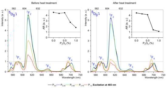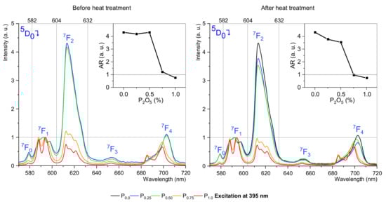 In the first analyzed case, it was observed that for excitation at 395 nm, the 5D0 → 7F2 transition strongly depends on the concentration of P2O5. The phosphorus oxide content up to 0.5 mol% hardly changes the luminescence compared to the sample without phosphorus oxide, but higher concentrations strongly change the luminescence spectrum, especially the 5D0 → 7F2 transition. Due to the 612 nm band being hypersensitive and strongly depending on the environment, such a change is a strong signal, indicating structural changes around Eu3+ ions. After the heat-treatment process, the luminescence changes are even more profound. There are interesting changes for the 5D0 → 7F1 transition, where a change of active sublevels (Stark’s effect) can be observed and resulting from changes in the structure of matter surrounding the europium ions. Usually, 5D0 → 7F1 splits into three Stark’s sublevels when the ion is located in a low symmetry site [], and this situation is observed for concentrations up to 0.5 mol% P2O5. For higher concentrations of phosphorus oxide, 5D0 → 7F1 splits into two sublevels. Changes in luminescence in the test samples are translated into changes in the asymmetry ratio. Between phosphorus oxide concentrations are 0.5 mol% and 0.75 mol% the asymmetry ratio (AR) decline rapidly.