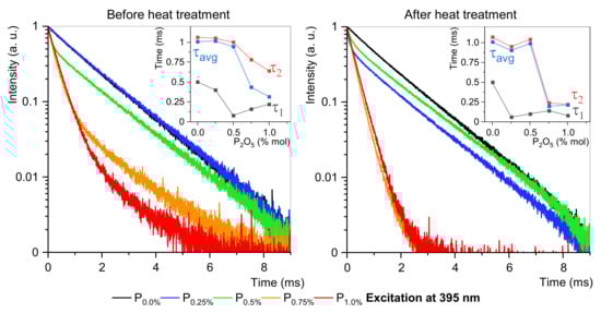 As in previous studies, this study also confirmed a change in the structure of the matter surrounding the Eu3+ ions. Table 4 and Table 5 show that two concentrations are critical 0.5 mol% and 0.75 mol% P2O5. Excitation at 395 nm shows that sample P0.5 is the first double exponential, and τ1 changes rapidly because of a new relaxation channel. For 0.5 mol% P2O5 concentrations and higher, τ1 grows slowly, and τ2 decreases. After heat treatment, τ2 changes fast, and it is almost flattered for P0.75 and P1.0 samples.