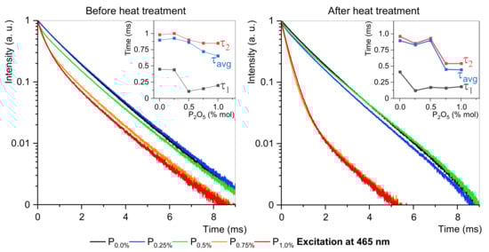 Excitation at 465 nm before heat treatment is analogous to excitation at 395 nm before heat treatment. A different situation is that after heat treatment, a known edge at 395 nm for 0.5 mol% P2O5 concentration moves to 0.75 mol% P2O5 concentration. Flattered zones for 0.75 mol% and 1.0 mol% concentrations of P2O5 are informative about the maximum concentration of P2O5. Therefore, higher concentrations of orthophosphoric will not significantly affect the shortened lifetime.