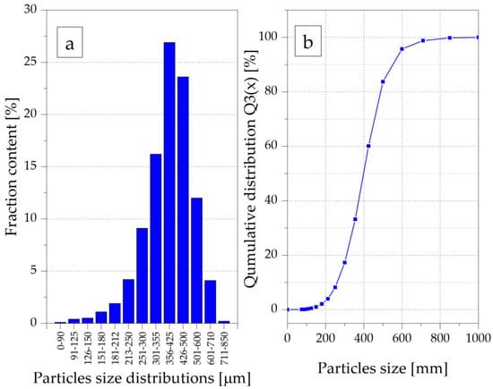 The first stage of the test sample preparation consisted of GTR grinding into smaller particles. Rubber granulates with a grain size of about 7 mm were precisely ground to a grain fraction in the range of 100–600 µm using the original knife mill [12,32]. In the tests, two sieves with a mesh size of 500 µm were used, and the peripheral speed of the cutting edges of the movable knives was 14 m/s. The hyperboloid cutting method, described in previous publications [41], was used to grind the rubber. The rubber grains obtained by knife cutting were characterized by flat surfaces and sharp edges; this proves that the main reason for the disintegration of the granulate was because of the cutting with straight knife edges in the intersection gap of 0.1 mm between the cutting edges of the knives. In this way, rubber particles with an average size of 400 µm were obtained. Photographs of exemplary GTR particles after grinding are shown in Figure 1. Grains ranging from 300 to 500 µm were dominant in the obtained powder (Figure 2a) and about 90% were smaller than 500 µm (Figure 2b).