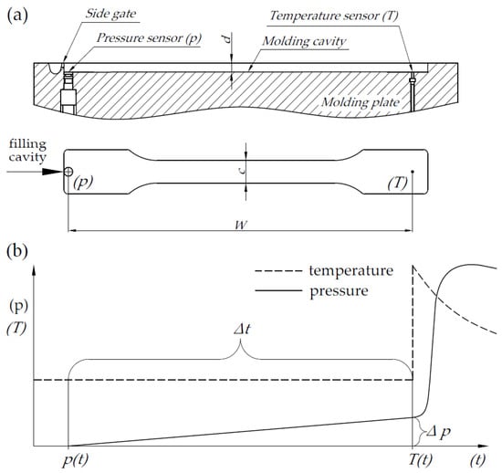 where Δp—is the pressure increase between signals from pressure and temperature sensors, d—is the mold cavity depth, and W—is the distance between sensors in the mold cavity (Figure 5a). Shear rate values were calculated from the formula: