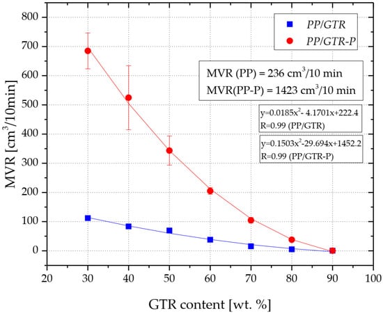The increase in the content of GTR in the copolymer matrix results in a gradual reduction of the volume-flow rate (MVR) of the obtained compounds (Figure 6). The MVR value of unfilled PP was about 235 cm3/10 min. Introducing 70 wt.% of GTR into the thermoplastic matrix resulted in a reduction of MVR of over 90% (15.5 cm3/10 min). The PP/GTR90 was characterized by the value of the volume-melt flow rate equal to only 0.5 cm3/10 min, which was due to only 10% of the mass of the plasticized phase in the tested material. Edogage [30] also recorded the decrease in the melt flow index value due to the increase in GTR content in homo-polypropylene. However, these tests were performed under standard conditions for PP (230 °C, 2.16 kg), and PP had a clearly lower MFI than the matrix used in the present research work. Therefore, the test results cannot be compared with each other. It is also worth noting that the low MVR values of the composites with the highest GTR filling were recorded at a relatively large mass of load (10 kg) which may indicate the limited possibilities of using this type of compound in the injection technology. This motivates the need to carry out rheological tests directly in the processing tool.