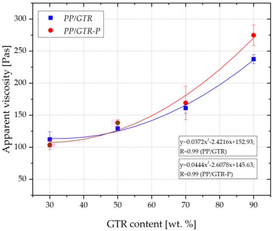 Influence of GTR content on the apparent viscosity of PP/GTR compounds.