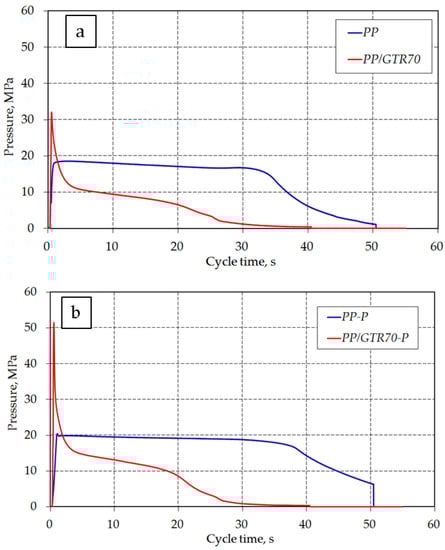 Pressure curves in the mold cavity for pure polypropylene and polypropylene filled with 70% GTR: (a) without DHBP, (b) addition of 1.5% DHBP.