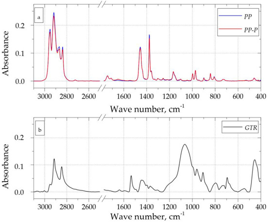 FT-IR spectra of PP, PP-P (a) and GTR samples (b).