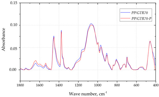 Chosen FTIR spectra recorded during the tests of PP/GTR70 and PP/GTR70-P samples are shown in Figure 11. The bands in the range from 1500 cm−1 to 800 cm−1 indicate that the scanned area contains elastomeric components, and the intense bands present at the wavenumbers of 1456 cm−1 and 1376 cm−1, confirm that the examined area of the sample also contained PP. The similar intensity of the 556 cm−1 band for both spectra indicates that during the reactive extrusion there was no breakdown of the C-C bonds. The reactive extrusion of the tested compositions, therefore, does not lead to a devulcanization process. The lack of additional bands on the PP/GTR70-P spectrum and the lack of change in the intensity of the remaining bands may indicate that during the processing of PP with GTR and organic peroxide, there was also no cross-linking of the matrix with the filler, as indicated by Wagenknecht [39]. Thus, the dominant chemical process during the reactive random extrusion of PP-GTR copolymers is the process of selectively cutting matrix macromolecules.