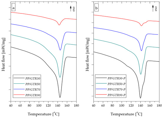 DSC melting curves of PP/GTR (a) and PP/GTR-P (b) compounds.