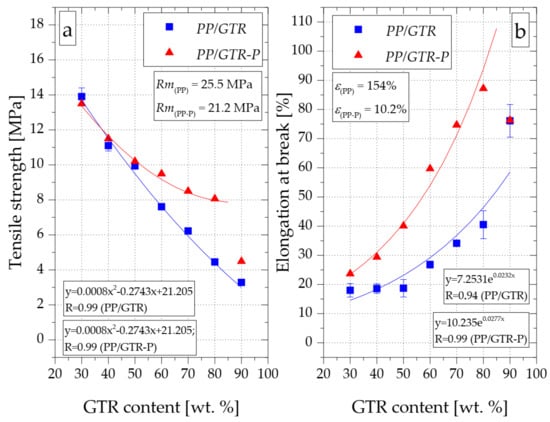 Influence of GTR content on tensile strength (a) and elongation at break (b) of PP/GTR compounds.