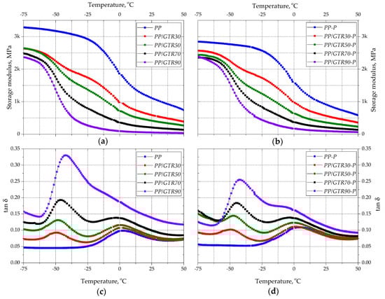 Viscoelastic properties of PP/GTR and PP/GTR-P compounds: storage modulus (a,b) and mechanical loss factor (c,d).