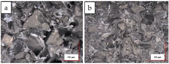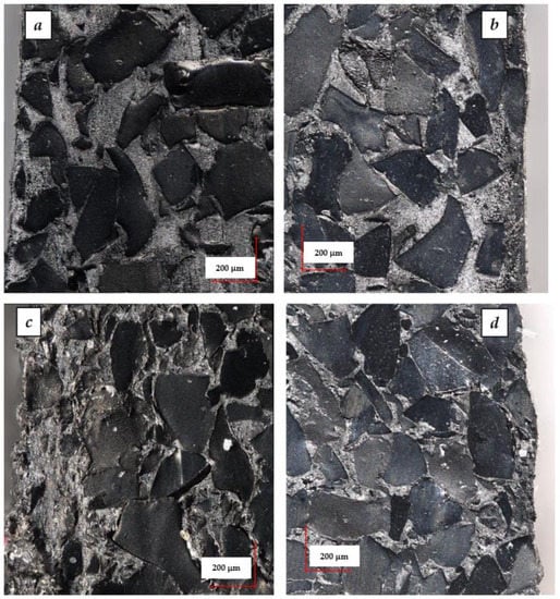 Figure 17a–d shows photographs of cross-sections of highly GTR filled polypropylene composites (70 wt.% and 90 wt.%), including their side edges. The photos confirm that despite the very high content of GTR, the samples are characterized by structure coherence. Moreover, all the photos show rubber grains with a size of 400–500 µm, which indicates that during the processing, the GTR was not extensively disintegrated in the plasticizing units of the extruder and injection molding machine. Moreover, it was observed that the outer layer of the samples was dominated by smaller grains with a size not exceeding 200 µm, while large grains are concentrated in the core of the moldings.