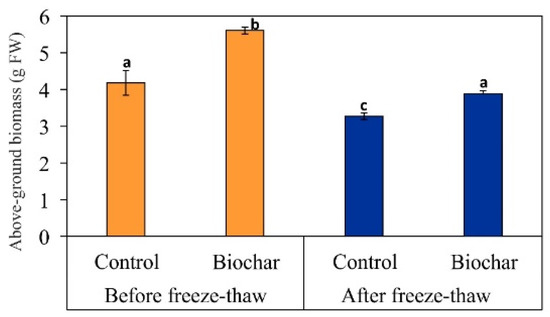 Effect of biochar amendment on above-ground biomass before and after freeze–thaw of a phytostabilized metal/metalloid-contaminated soil cultivated with Lolium perenne L. See Materials and Methods for detail on experimental set-up. Data are mean ± standard deviation (n = 3). Values followed by different letters differ significantly (ANOVA followed by Tukey’s HSD test, p < 0.05).