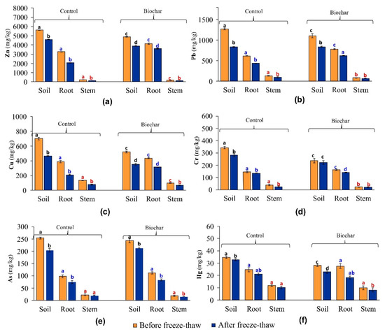 Interaction between plant roots and soil nutrients always takes place, while its intensity depends on plant physiology, plant species, and soil chemistry. Large-scale aided-phytostabilization surveys indicate the presence of a higher accumulation of metal(-loid)s in plant roots than in their above-ground parts [15,51]. As seen from Figure 2 (bars for individual organs of Lolium perenne L.), a significantly higher accumulation of Zn, Pb, Cu, Cr, As, and Hg was found in plant roots than in the stems, both in non-amended and biochar-amended series, before freeze–thaw as well as after freeze–thaw treatment, respectively. This relationship was particularly visible following biochar addition to the soil. It is known from the available literature that at moderate temperatures, the addition of biochar leads to the immobilization of Cr, Zn, Pb, and Cd in soil, which, at the same time, leads to a decrease in the total content of these elements in above-ground parts of plants [52,53].