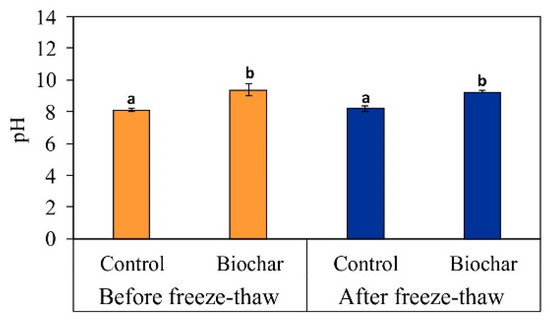 The soil pH value has an especially significant influence on the processes of initiating and immobilizing metal(-loid)s, both on farmland and in post-industrial areas [59]. As seen in Figure 3, there was no significant difference between before and after freeze–thaw treatment in terms of soil pH values. The application of biochar resulted in an increase in pH by 1.27 units (before freeze–thaw) and by 1.03 units (after freeze–thaw treatment) in relation to the corresponding control series before and after freeze–thaw treatment, respectively. Biochar is characterized by liming properties and thus contributes to decreasing exchangeable acidity and aluminum saturation in soil [60]. In studies by Yiang et al. [61], the addition of corn straw biochar to uncontaminated soil increased its pH by 0.10 units after thirty freeze–thaw cycles had been carried out.