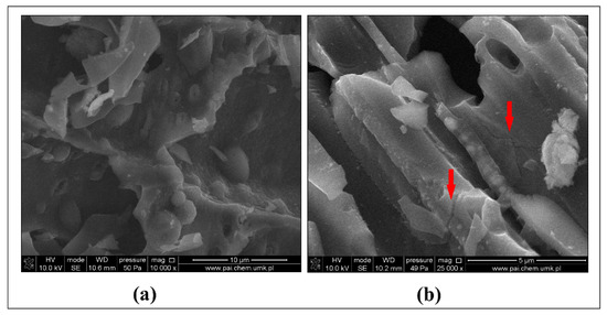 The immobilization of metal(-loids) in soil following the application of biochar takes place due to the calcification effect and adsorption, which may cover precipitation, complexing, cation exchange, and electrostatic attraction [62]. Metal(-loid)s occurring in soil compete for biding sites on biochar surface. Namgay et al. [57] showed that the sorption strength of metal(-loid)s by biochar decreases in the order of Pb > Cu > Cd > Zn > As. As seen from Figure 2 (bars for soil), the total content of Zn, Pb, Cu, Cr, As and Hg in the soil before exposure to freeze–thaw as well as after freeze–thaw treatment was significantly dependent on the addition of biochar. Its application, in phytostabilized soil before freeze–thaw, most significantly decreased the total content in the following order: Cr (32%), Cu (26%), Hg (19%), Pb (13%), Zn (12%), and As (4%) as compared to the corresponding control series before freeze–thaw. In phytostabilized biochar-amended soil after freeze–thaw, the observed decrease in the total content of the analyzed metal(-loid)s followed the respective order: Hg (31%), Cu (24%), Cr (21%), and Zn (15%) as compared to the corresponding control series after freeze–thaw. In contrast, a slight increase was observed for Pb (0.4%) and As (5.0%) in biochar-amended soil after freeze–thaw treatment. The decomposition of soil aggregates during the freeze–thaw cycles may have facilitated an increase in unstable metals [63] by releasing dissolved organic carbon, which makes metal(-loid)s more mobile [64]. The fact that multiple freezing–thawing cycles have a positive effect on the surface area of biochar is also of significance. Wang et al. [65] showed that, after exposure to 30 freeze–thaw cycles, the surface structure of biochar changed significantly in terms of increasing its surface area and pore structure. In our study, upon the completion of 16 freeze–thaw cycles (over 64 d), the surface area of biochar particles underwent an increase of nearly 2.1% when compared to particles that had not been subjected to such cycles. Before freeze–thaw treatment biochar was characterized by a surface area of 313.73 m²/g, which underwent an increase after 16 freeze–thaw cycles to a value of 321.01 m²/g. Coarse ground biochar is more susceptible to freeze–thaw in terms of creating additional cracks on its surface than fine biochar particles with a diameter equal to or less than 0.5 mm (herein under study) and, in consequence, the well-developed surface of biochar was found to have been only slightly enlarged after exposure to freeze–thaw. The small cracks resulting from exposure of biochar after 16 cycles were detected by additional SEM measurements and are shown as a vertical down arrow in Figure 4. Thus, following freeze–thaw, especially in the case of Hg and Cu occurring in soil, the content of these elements was lower with biochar application by 31% and 24%, respectively, when compared to the control series. Another outcome from the literature [35,65] is that, after exposure to multiple freeze–thaw, the number of functional groups containing oxygen (-OH, -COOH and -C=O) in biochar increases, which has a positive effect on the complexation of metals onto the biochar surface and their long-term immobilization in seasonally frozen soils. Thus, the resulting relative decrease in Hg and Cu content in the soil after exposure to freeze–thaw in our study can be assigned to the formation of functional groups rather than the observed slight increase in biochar surface area.