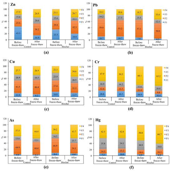 Application of biochar as a soil amendment and freeze–thaw affected metal(-loid)s distribution in phytostabilized soil (Figure 5). In phytostabilized control soil, before freeze–thaw, most of the metal(-loid)s, i.e., Pb, Zn, Cr, and Hg characterized by higher mobility (based on the share in the F1 fraction) compared to biochar-amended soil. This indicates a positive effect of biochar and phytostabilization process on metal(-loid)s immobilization. The most visible change in the metal(-loid)s mobility between amended and non-amended soil was observed for Zn, i.e., 43.5% of F1 (control soil) vs. 33.5% of F1 (biochar-amended soil). Biochar is known to enhance Zn transformations from mobile into stable fractions [66,67]. On the contrary, the share of F1 fraction for Cu and As was higher by a few percent in biochar-amended soil than in control. Biochar can increase the mobilization of some elements like Cu and As due to their complexation with dissolved organic matter from biochar [68]. An increase in As mobility by biochar can be also related to alkaline pH (higher in biochar-amended soil than in control soil) and possible redox reactions [68].