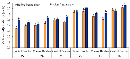Changes in metal(-loid)s stability (as Ir) in phytostabilized non-amended (control) and biochar-amended soil samples, before and after freeze–thaw. For a given metal(-loid), different letters indicate significant differences in its stability in soil (p < 0.05).