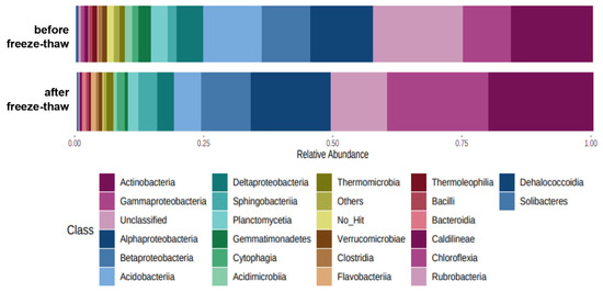 At a class level, freeze–thaw strongly increased the abundance of Actinobacteria, Sphingobacteria, Flavobacteria and Rubrobacteria in soil (Figure 7); the abundance of Rubrobacteria was significantly higher than in soils before freeze–thaw. Those classes usually predominate in soil and in the rhizosphere of metallophytes, significantly affecting phytoremediation effectiveness [93,94]. The metallophytes as a specific plant can tolerate high levels of potentially toxic elements. Freeze–thaw affected the distribution of classes within phyla Proteobacteria. In freeze–thaw-exposed samples, abundances of Gammmaproteobacteria and Alphaprotepbacteria significantly increased, the abundance of Betaproteobacteria did not change and the average abundance of Deltaproteobacteria decreased. A study by Navas et al. [95] has shown that Proteobacteria predominated in soil with a high content of metal(-loid)s while Actinobacteria were more abundant in soil with low content of metal(-loid)s. The higher resilience of Proteobacteria to high content of metal(-loid)s can be related to the fact that they are Gram-negative bacteria and possess an outer lipopolysaccharide layer in their cell wall that sequestrates metals extracellularly conferring adaptation to harsh contaminated environments [96]. Actinobacteria are an important member of soil microbiome participating in carbon cycling and production of soil organic matter [94,97]. The good ability of Actinobacteria to maintain their metabolic activities under low temperatures can be explained by cross-feeding or cooperation with other soil bacterial species [98].