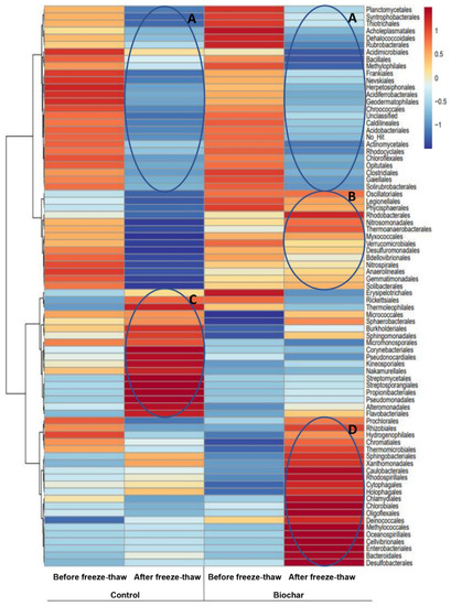 Application of freeze–thaw visibly decreased abundances of Planctomycetales, Syntrophobacterales, Thiotrichales, and Frankiales in soil non-amended with biochar and Rubrobacterales, Acidimicrobiales, Bacillales, and Methylophilales in biochar-amended soil (Figure 8, group A). However, the addition of biochar to soil released the negative effect of freeze–thaw for a group of bacterial orders (Figure 8, group B) crucial for chemical conversions in soil, especially for N cycling. In general, freeze–thaw increases inorganic nitrogen losses through leaching from the soil, and as a result, a decrease in the biomass of the crop is observed the following growing season [102]. In our study, this N leaching may have resulted in a significant decrease in the abundance of both Nitrosomonadales and Nitrospirales that was observed in the unamended control soil. Biochar amendment increased soil N retention during freeze–thaw and N accessibility to microorganisms thus favoring the growth of Nitrosomonadales and Nitrospirales. Biochar addition also allowed the preservation of Verrucomicrobia, Gemmatomonadales, and Thermoanaerobacterales. Microorganisms belonging to Verrucomicrobia prefer high soil pH and total carbon and nitrogen content [103], ensured by biochar addition, and take part in both nitrogen fixation [104] and polysaccharide degradation in soils [105]. Gemmatomonadales have a unique regulatory mechanism of N2O reduction [106] while members of Thermoanaerobacterales can metabolize recalcitrant organic compounds at high N content in soils [101,107].